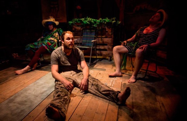 Designer Sarah Booth’s set is simple, but a confusing mix of abstract and functional elements. A huge, bright red quilt with Pierre’s slogan takes up half the stage and is only referred to once, near the end. Its visual dominance is impossible to ignore but it has hardly any bearing on the story. However, Booth’s creation of a bed that’s revealed from a nondescript cupboard is a great device. Philip Matejtschuk’s composition and sound design adds further depth, emotion and context that the set avoids, giving the show a more rounded, polished feel.