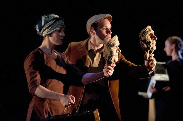 In Translunar Paradise, Deborah Pugh joins him as his wife’s spirit, or a figment of the man’s imagination. It’s not clear which, but neither does it particularly matter. The episodic montage of memories contrasts their time together and the old man’s mourning. The two performers have a wholly convincing chemistry and are a charming and funny pair. Both show great range in playing young and old, and the masks, in their immovability, draw attention to the rest of their bodies – intimacy, despair, love and anguish are easily discernible, and their precision is flawless.