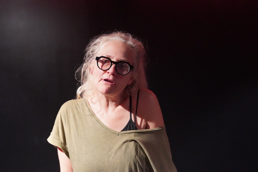 The performance is set in a black box with only a wooden table and two chairs. Waterhouse enters with a pile of freshly laundered socks and a cup of tea, establishing a domestic and intimate tone. Her performance is the highlight of the show. Her unadorned portrayal brings a raw quality to the character that is both poignant and unassuming. We can’t help but be charmed by this unconventional granny and the stories she invents. They cheer up her mother, strangers, and herself, tweaking reality as needed to provide a source of comfort, from delightful trips to Aldi for her mother, to high-heeled dominatrix escapades for her clients.